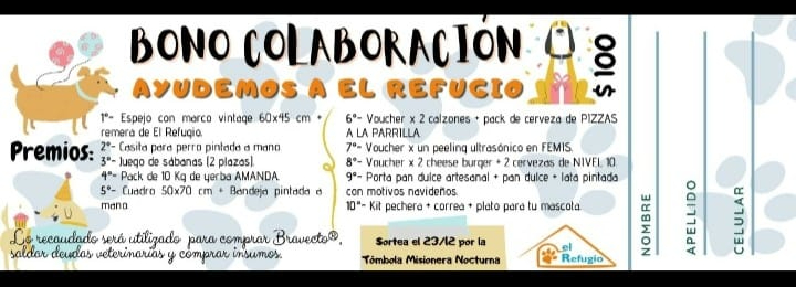 Etelvina Sorghe, fundadora de El Refugio, contó a PRIMERA EDICIÓN que para juntar dinero “organizamos un bono colaboración de 100 pesos que lo pueden adquirir en la veterinaria ubicada en la esquina de la avenida Francisco de Haro y Trincheras de San José. También llamando o enviando un mensaje al 3764-664629, tenemos Mercado Pago también para aquellos que quieran colaborar, no tendría ni que moverse de su casa, más teniendo en cuenta la pandemia por la que atravesamos”, dijo.