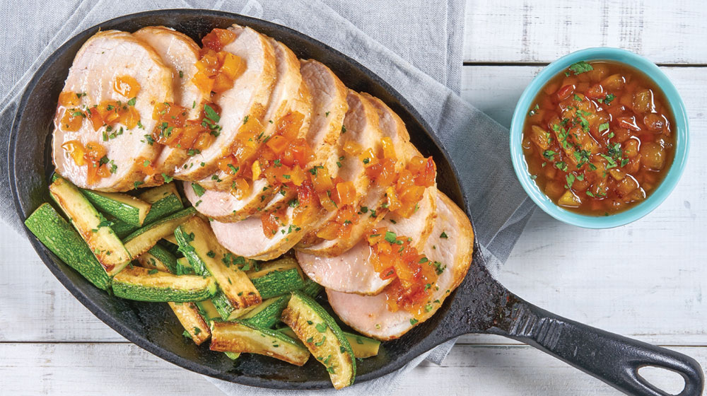 Sirve el lomo con las calabacitas y la salsa de durazno agridulce.