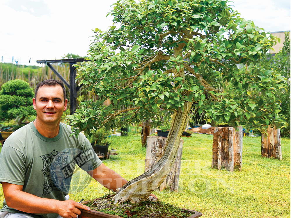 Al tiempo que recordó que “lo aprendí con mi amigo Jorge Machado, hace 24 años. Él, a su vez, aprendió de un amigo suyo, y empezamos sin nada. Es una técnica que se reduce por medio de podas, de gajos, ramas, estructural, y de raíces, dándole forma con alambre”.