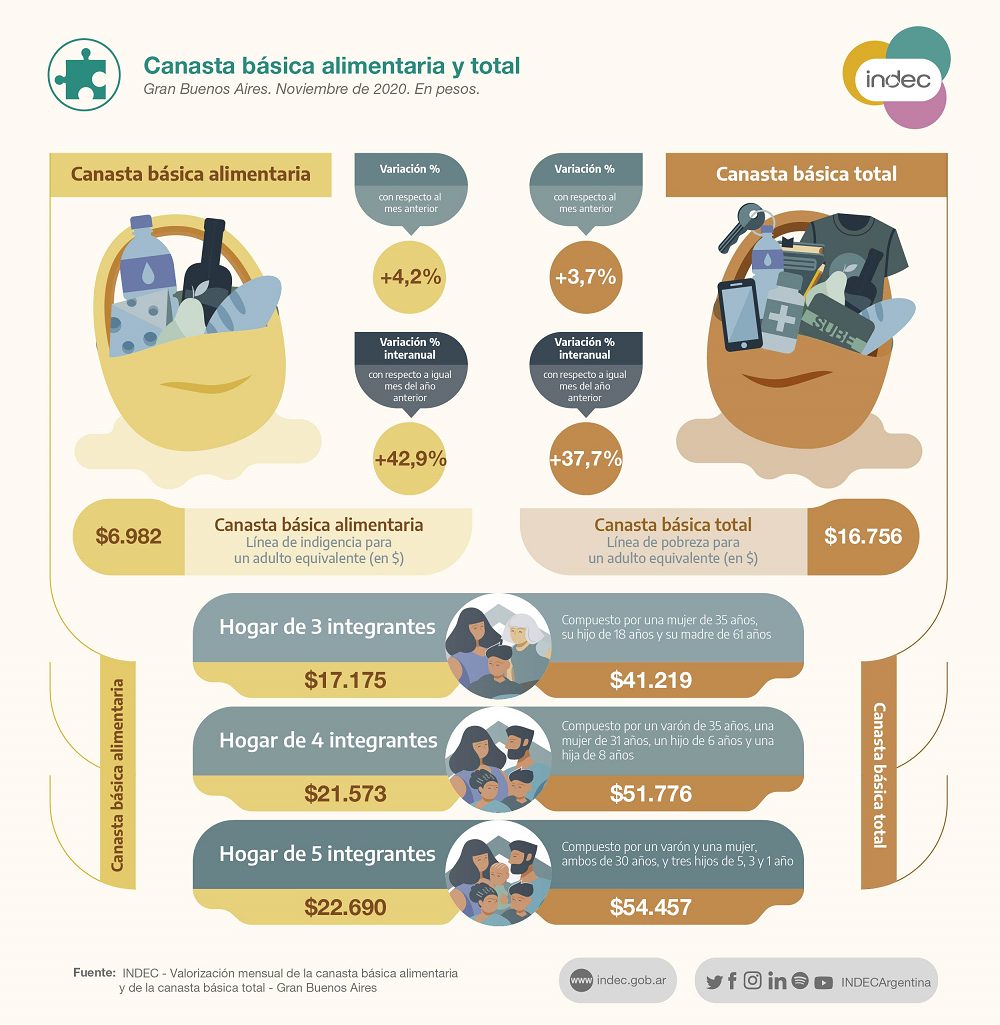 La canasta alimentaria está integrada por los artículos que reúnen los requerimientos calóricos y proteicos necesarios para un varón adulto, y la básica total incluye estos alimentos más el costo de servicios públicos y otros gastos.