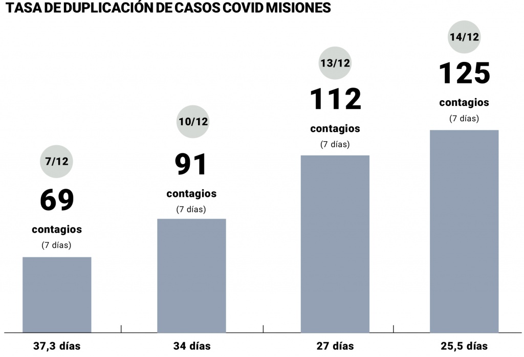 A nivel provincial, los datos estadísticos dan cuenta que se han incrementado la cantidad de contagios de COVID-19 registrados en un período de tiempo más corto. Para tener esta trazabilidad, la cartera sanitaria utiliza los datos de la cantidad de positivos registrados en Misiones en un promedio de una semana de diferencia. Gracias a esto, es posible contabilizar la tasa estimada de duplicación de casos que actualmente es de 25,5 días según el último informe del día 14 de diciembre. Es importante contar con este cálculo porque estima cuántos días podría tardarse en duplicar la cantidad de infectados en un lugar determinado. A partir de este ritmo de crecimiento es que las autoridades sanitarias a lo largo del mundo toman medidas restrictivas.
