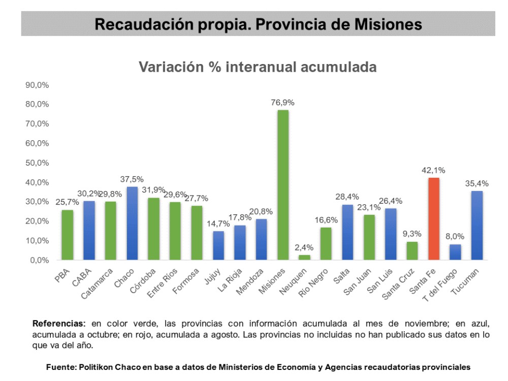 Comparando el comportamiento misionero con la de las demás provincias de la región del NEA, se observa que la recaudación en Misiones ha tenido un comportamiento radicalmente distinto, creciendo a ritmos muy superiores que el resto (no se analiza Corrientes ya que no publicó sus datos). Formosa registró recién en el mes de noviembre su primer crecimiento real del año, mientras que el Chaco (con datos hasta octubre) tuvo varios vaivenes, pero en el acumulado anual se mantiene con caídas reales.