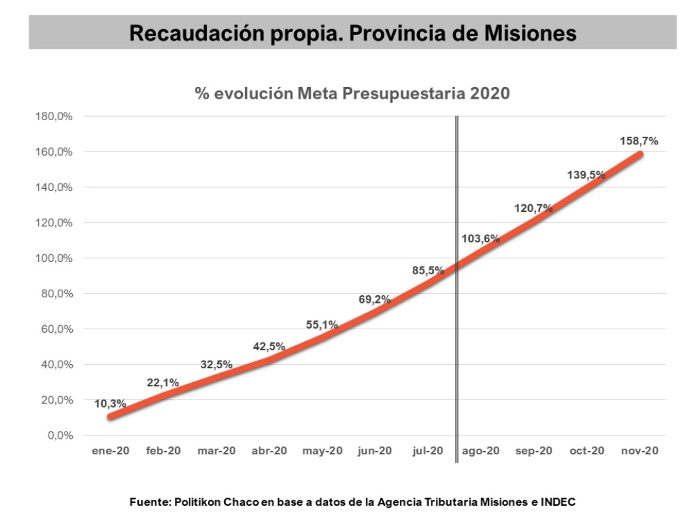 Este incremento de la recaudación misionera superó ampliamente la meta establecida en el Presupuesto provincial 2020: la misma se fijó en el valor final de $19.116,9 millones, pero a dicho monto se llegó ya a finales de julio, a partir de los notables incrementos mencionados anteriormente.