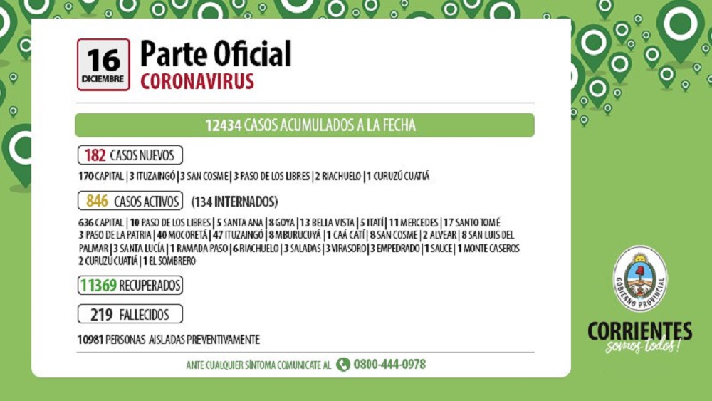 Con ellos, se eleva a 12.434 la cantidad total desde marzo, de los cuales 846 permanecen activos, 47 de ellos en Ituzaingó, 17 en Santo Tomé y 3 en Gobernador Virasoro.