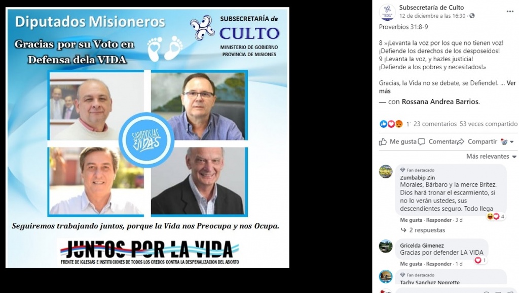 “Gracias, la Vida no se debate, se Defiende!. MISIONES ES VIDA! Todos deben saber quiénes son los que defendieron desde su espacio de representantes Misioneros a las dos Vidas!. A los otros, la Justicia Divina, siempre llega...”, se escribió con las fotografías de los legisladores nacionales misioneros.