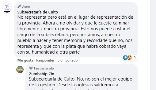 A medida que aparecieron las reacciones contra la publicación, la diputada Morales las fue compartiendo en sus redes sociales. Cultos de la provincia no bajó ninguno de los posteos hasta las 16 del miércoles.