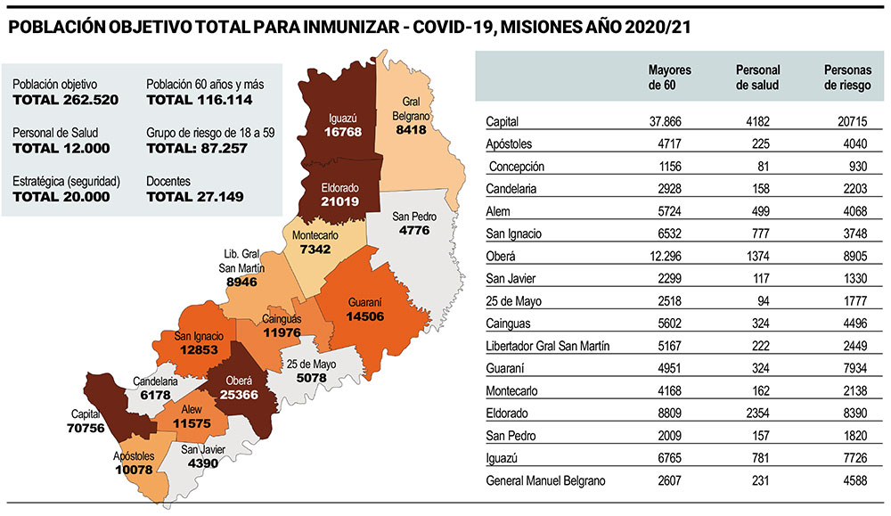 En Misiones, la población objetivo para recibir la vacuna contra el COVID-19 está compuesta por 116.114 personas mayores de 60 años, 12.000 trabajadores de la salud, 87.257 personas de 18 a 59 que integran el grupo de riesgo por padecer enfermedades crónicas, 27.149 docentes y 20.000 población estratégica (personal de seguridad).