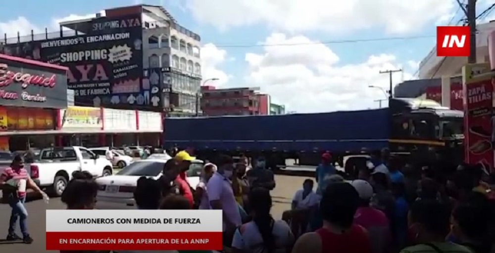 Integrantes de la Asociación de Camioneros del Paraguay, implementan una medida de fuerza en Encarnación, bloqueando con camiones de gran porte la ruta internacional en inmediaciones al puente San Roque González de Santa Cruz.