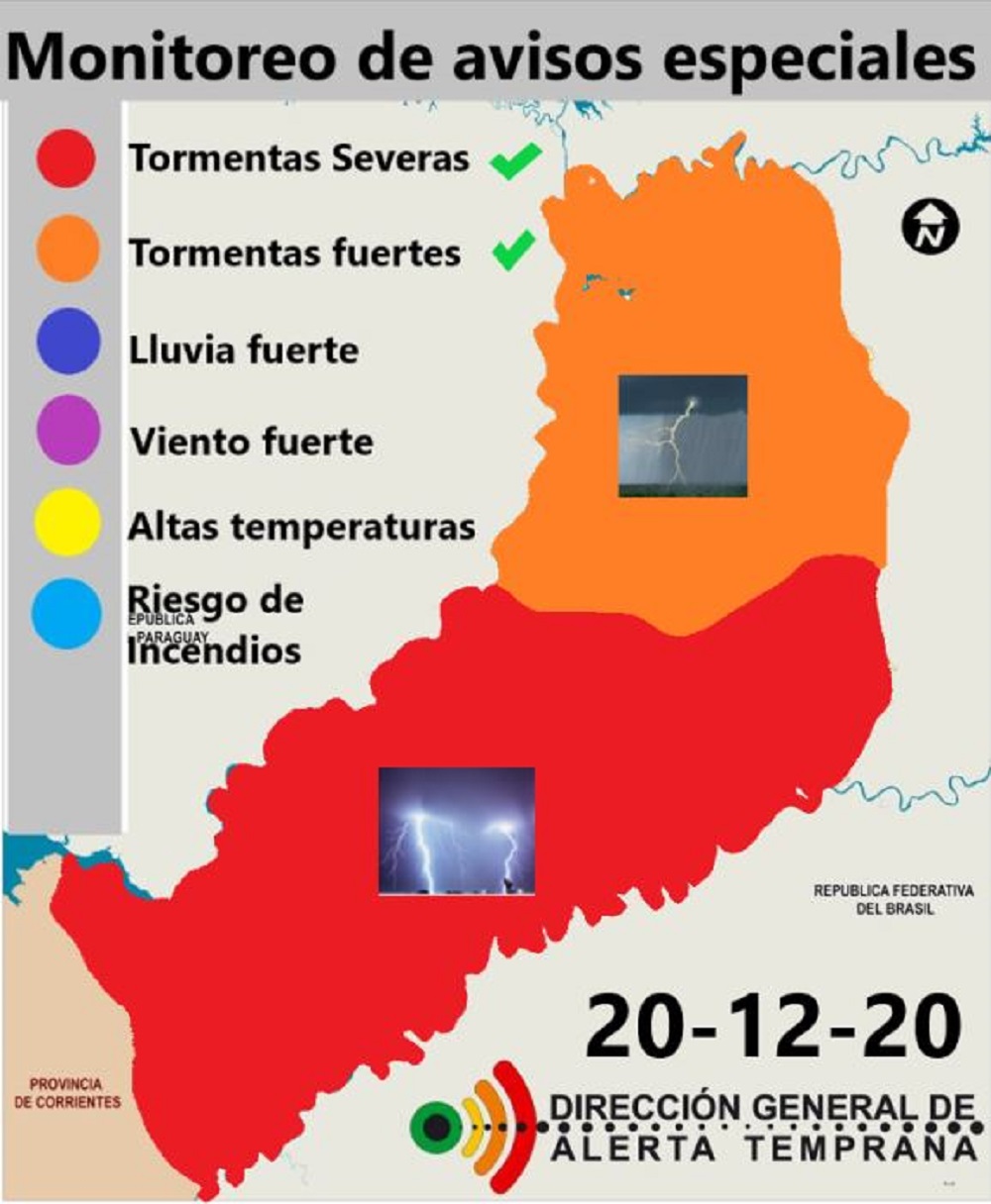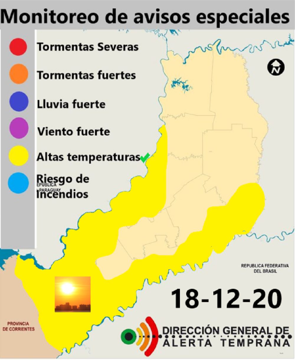 La Dirección General de Alerta Temprana de Misiones, dependiente del Ministerio de Ecología provincial, emitió este jueves una advertencia naranja por altas temperaturas en el Sur de la tierra colorada y amplias franjas de las costas de los ríos Paraná y Uruguay.
