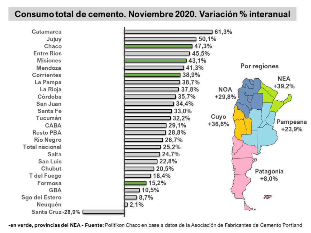 De este modo, en términos de volumen, Misiones muestra un récord tocando un techo histórico, y así se convierte en la principal consumidora de cemento en el NEA, al obtener un nivel de participación del 34,7% del total, mientras Chaco lo hace en un 27,8%, Corrientes en un 25,9%, y Formosa en 11,7%.