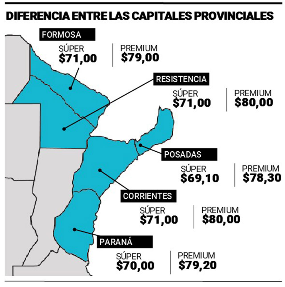 Así, en las estaciones YPF de Posadas el litro de nafta Súper se ofrece a un valor de $69,10. Mientras que en Paraná, capital de Entre Ríos, se debe pagar $70 por el mismo producto. Y en Corrientes, Formosa y Resistencia (Chaco) el precio es de $71.