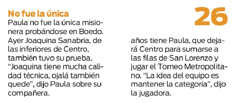 “La idea que tienen en el equipo es mantener la categoría, entonces están buscando gente con experiencia para afrontar un torneo como el Metropolitano”, reconoció Paula. “Esa fue una de las cosas que más destacaron de lo que vieron de mi juego en el amistoso que era activa, pedía la bocha, la buscaba, eso los terminó de convencer”, agregó.