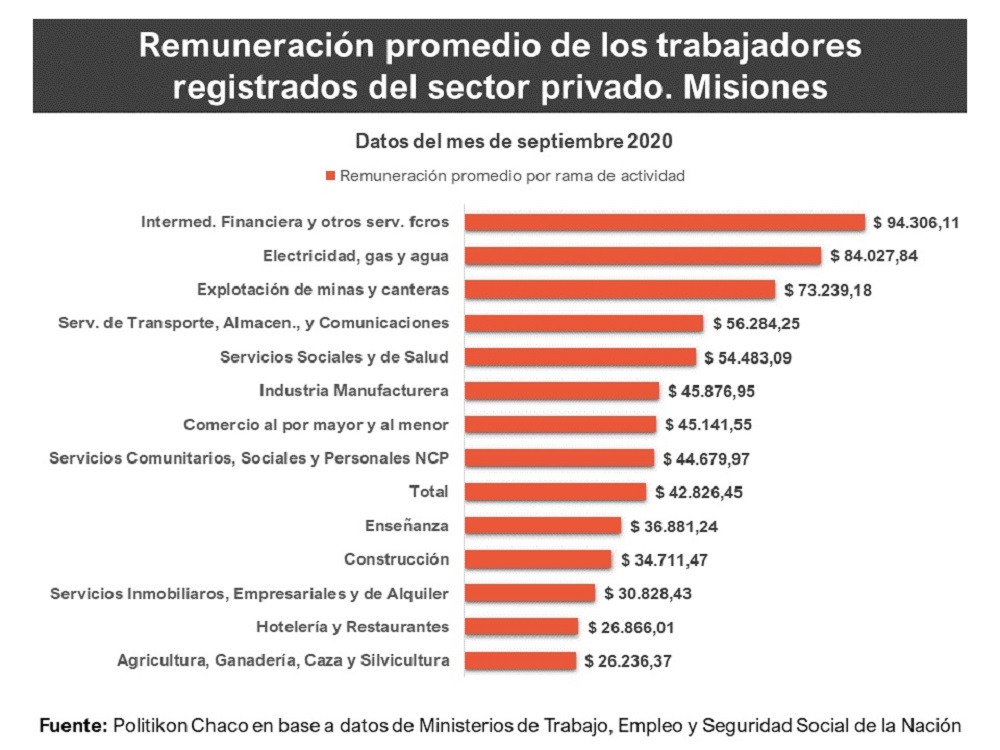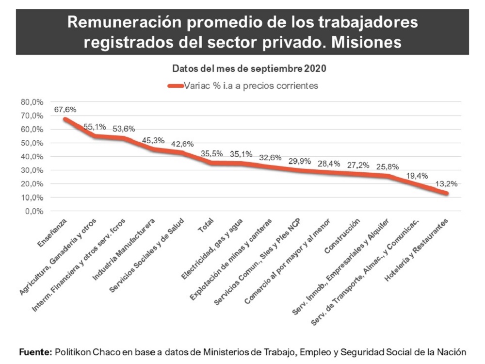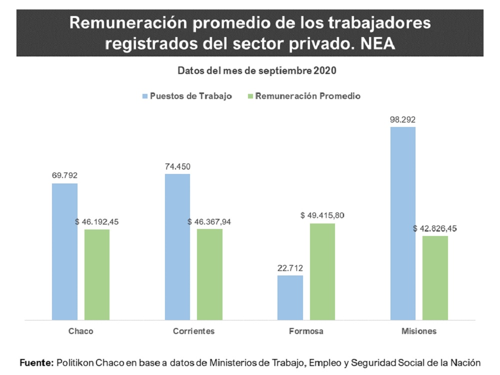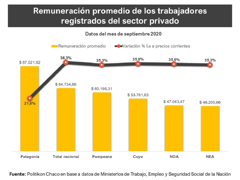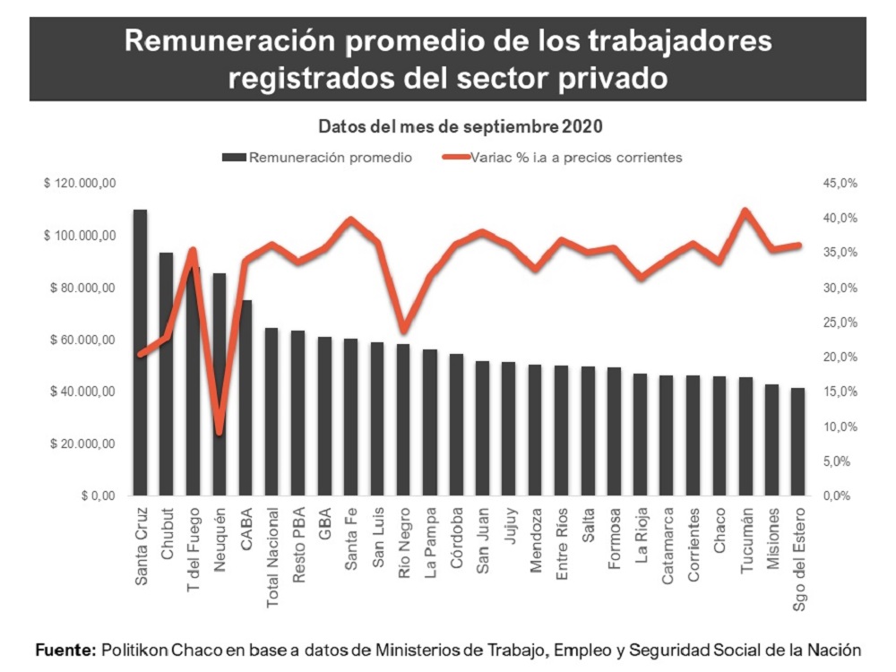 La remuneración promedio de los trabajadores registrados del sector privado de la Argentina fue de $64.734,86 mensuales en septiembre de 2020, creciendo a nivel interanual un 36,3%, levemente por debajo del incremento anual del IPC para ese mismo mes, que marcó 36,6%. Hacia dentro de las provincias, únicamente en cinco distritos se supera ese monto: Santa Cruz, Chubut, Tierra del Fuego, Neuquén y la Ciudad Autónoma de Buenos Aires, mientras que en las otras 19 jurisdicciones corre por debajo, según un relevamiento de la consultora Politikon Chaco en base a datos del Ministerio de Trabajo de la Nación.