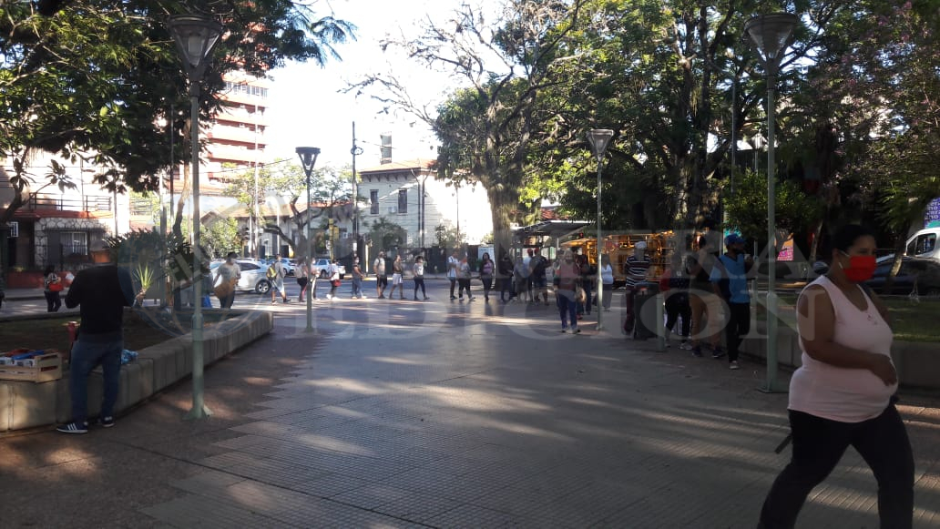 Desde esta mañana se registraron largas filas en la plaza San Martín de Posadas para el Mercadito Solidario.