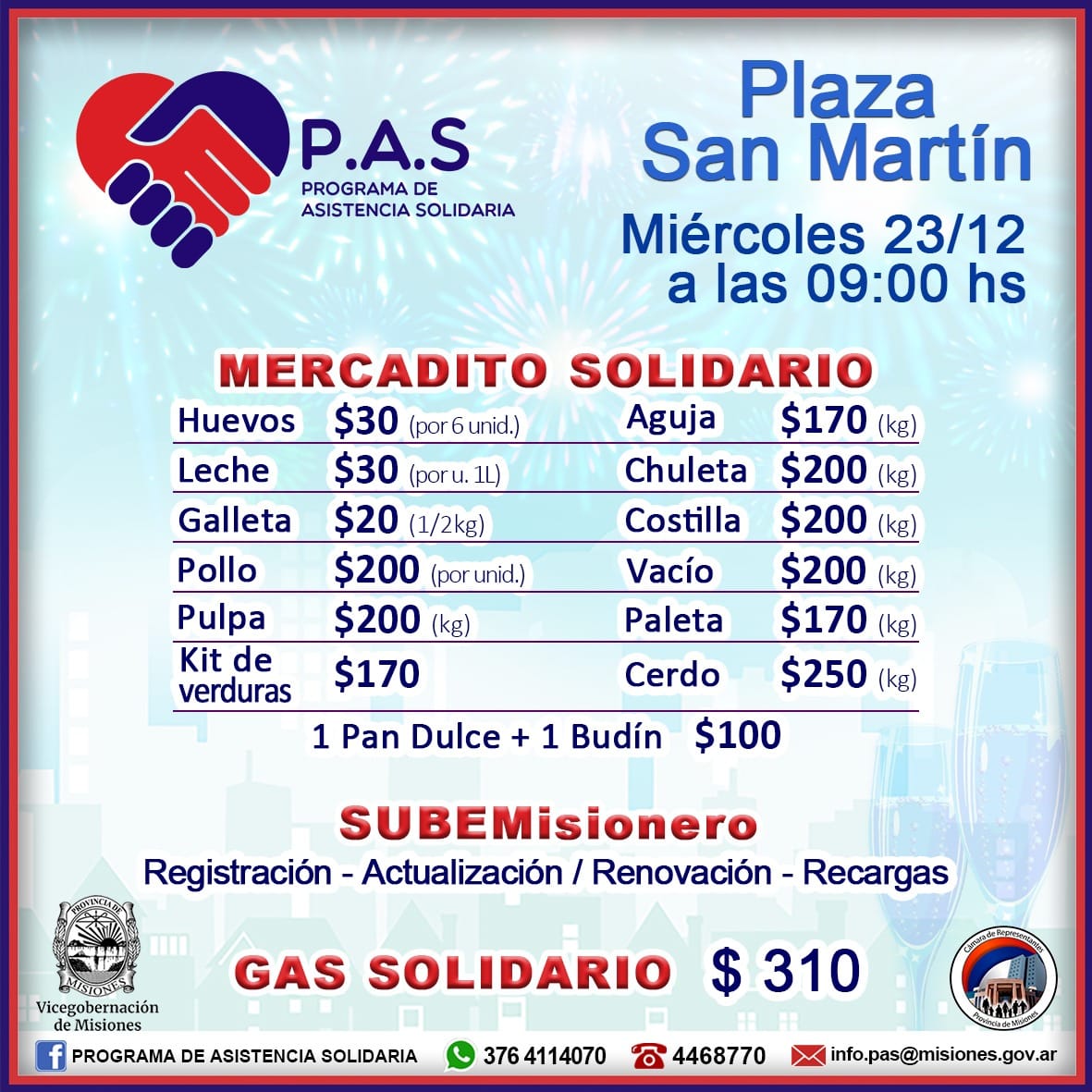 El PAS- Posadas, que depende de Vice gobernación, acercará hoy a partir de las 9, los servicios del mercadito y gas solidario, también los trámites de la tarjeta Sube Misionera a la Plaza San Martín en Posadas.