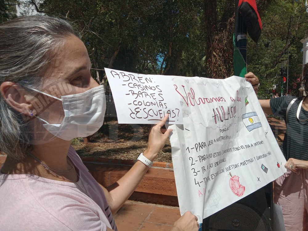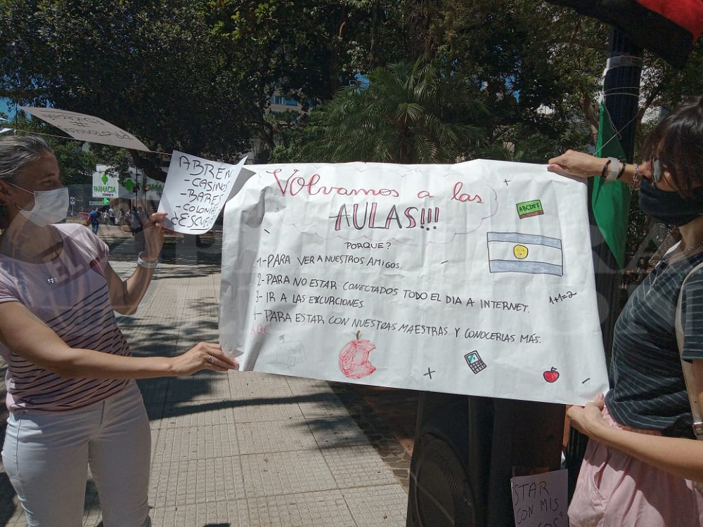 A partir de las 10.30 horas, miembros de la organización Padres Organizados se convocaron en la Plaza 9 de Julio para exigir que el próximo año, todos los niveles educativos se dicten de manera presencial.