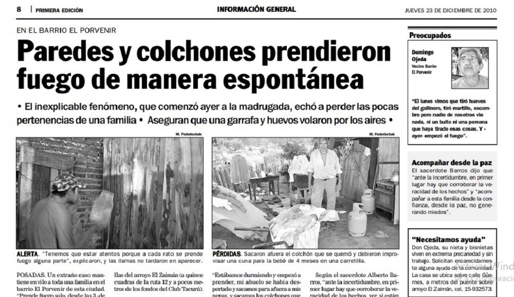 Allá por diciembre de 2010, un extraño caso mantenía en vilo a toda una familia en el barrio El Porvenir de Posadas: “Prende fuego solo, desde las 3 más o menos”, intentaron explicar tras haber pasado la madrugada en vela al observar que repentina y alternadamente comenzaron a encenderse llamas en las paredes de madera de la vivienda, un armario, colchones y ropas.