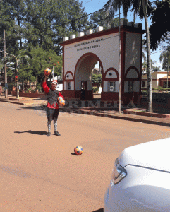 Malabares con pelotitas, clavas, aros son parte de su repertorio. Siempre con una sonrisa agradece lo poco o mucho que recibe y también saluda a quienes pasan de largo.
