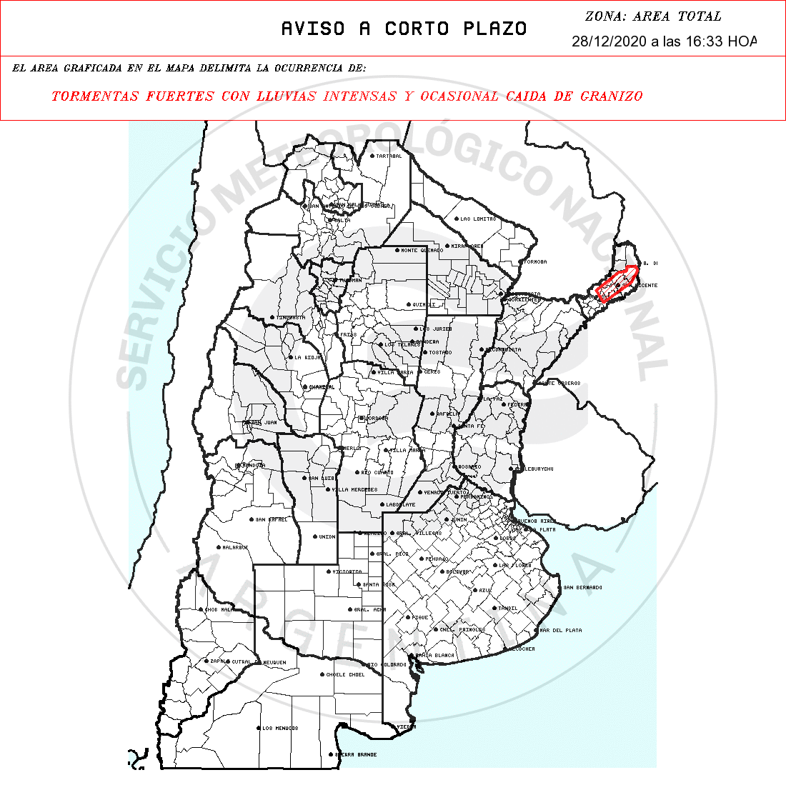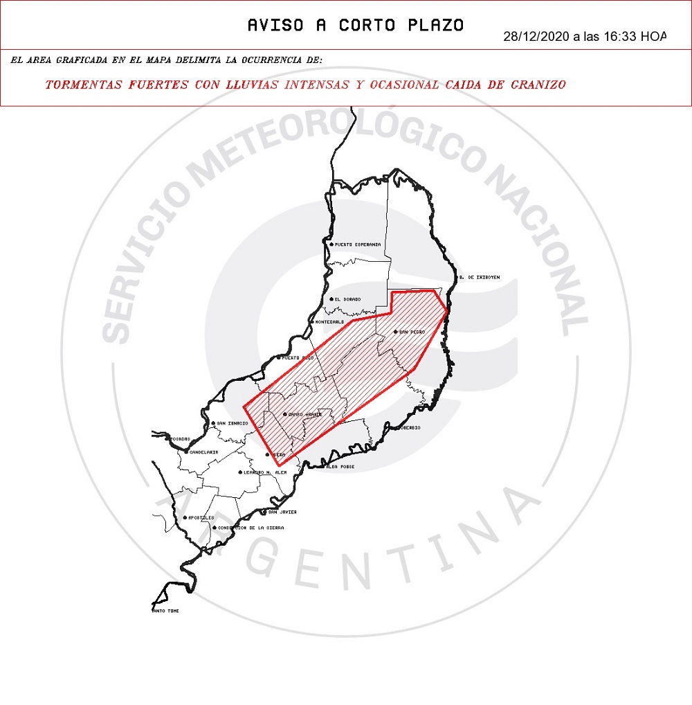 La advertencia, que regía para los departamentos 25 de Mayo, Concepción, Guaraní, Leandro N. Alem, Oberá, San Javier y San Pedro, se reforzó pasadas las 16:30 con un nuevo aviso que incluía también a Libertador General San Martín.