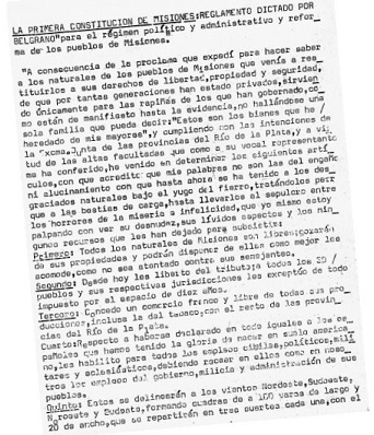 Mientras se encontraba en el campamento de Tacuarí, el general Manuel Belgrano redactó lo que algunos consideran la primera Constitución de Misiones, un texto de treinta artículos con una fuerte impronta social.