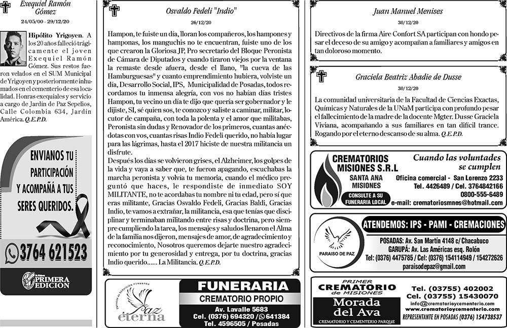 Fúnebres del Jueves 31 de Diciembre de 2020