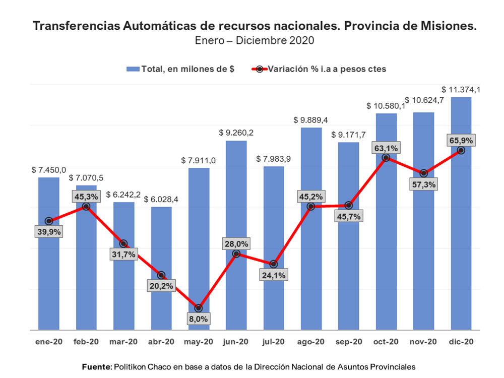 Con estos datos, en el acumulado enero – diciembre 2020, Misiones terminó captando $70.286,4 millones por transferencias automáticas, con un incremento del 38,9% nominal, que quedaría levemente por debajo de la inflación del NEA proyectada para el 2020, cuyos datos se oficializarán a mediados de enero.