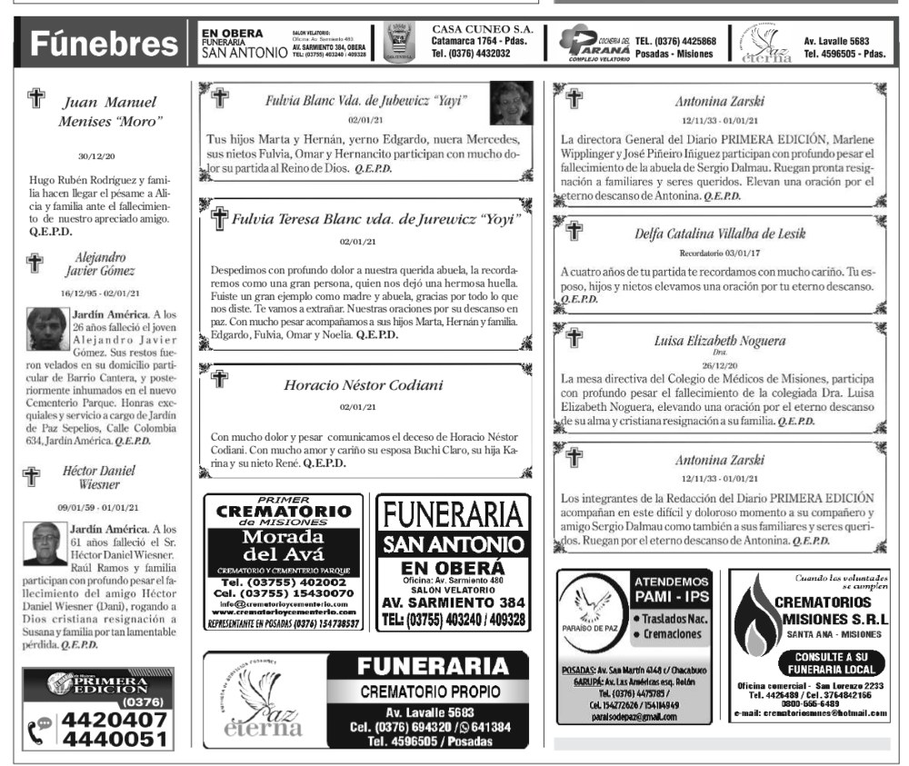 Fúnebres del domingo 3 de enero de 2021