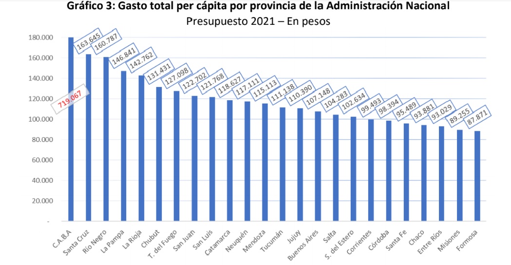 De acuerdo a un informe del Instituto Argentino de Análisis Fiscal (IDESA) “para analizar el presupuesto con una visión económica es conveniente relativizar el gasto por provincia a su cantidad de habitantes. Para esto, conviene utilizar las proyecciones de INDEC para la población que cada provincia tendría en 2021”.