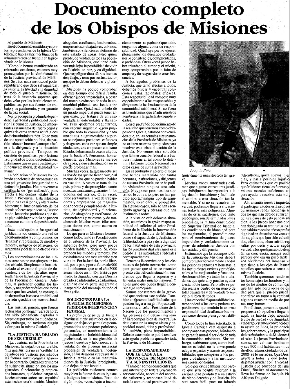 El 4 de enero de 1996, los dos obispos que por entonces tenía la Iglesia Católica en Misiones (aún no había sido creada la Diócesis de Oberá) hicieron público un duro documento sobre “Indefensión e inseguridad jurídica” en el que pedían la intervención federal de la Justicia misionera.