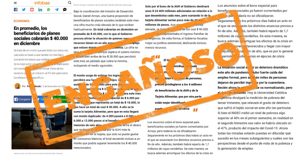 Un artículo del sitio web Infobae publicado el 3 de diciembre último afirmó que “en promedio, los beneficiarios de planes sociales cobrarán $ 40 mil en diciembre”.