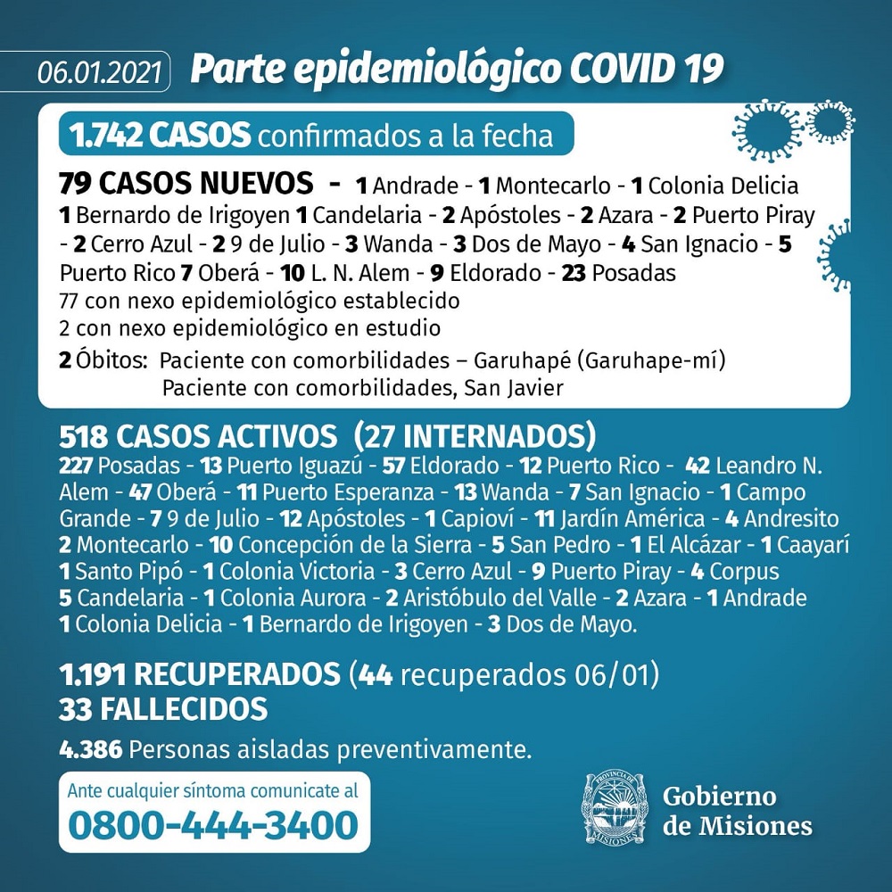 El parte epidemiológico de la provincia de Misiones registró 79 casos nuevos y dos fallecidos, ambos con comorbilidades. El primero se trata de un paciente de Garuhapé y el segundo era una persona oriunda de San Javier. Así, Misiones llegó a los 33 muertos por COVID-19.