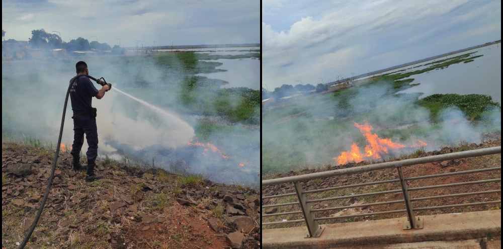 Posteriormente, volviendo a la base, nuevamente visualizaron un foco ígneo al lado del puente sobre el arroyo Zaimán de Posadas. Allí, desplazaron la línea devanadera de alta presión (manguera) y lograron sofocar el incendio de basura y malezas.