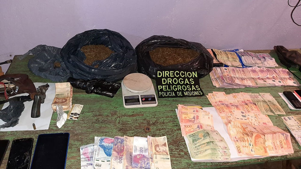 Una vez adentro de la casa, y tras ser requisados distintos sectores, fueron secuestrados 1 kilo 800 gramos de marihuana; una balanza electrónica;123.240 pesos; teléfonos celulares y un arma de fuego.