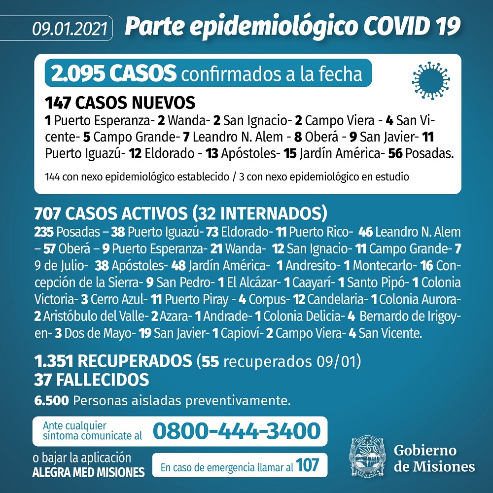 Los nuevos contagiados se que se registraron corresponden a: (1) Puerto Esperanza, (2) Wanda, (2) San Ignacio, (2) Campo Viera , (4) San Vicente, (5) Campo Grande, (7) Leandro N. Alem , (8) Oberá, (9) San Javier, (11) Puerto Iguazú, (12) Eldorado, (13) Apóstoles, (15) Jardín América y (56) Posadas. Hay 144 personas con nexo epidemiológico establecido y otras 3 siguen en estudio.