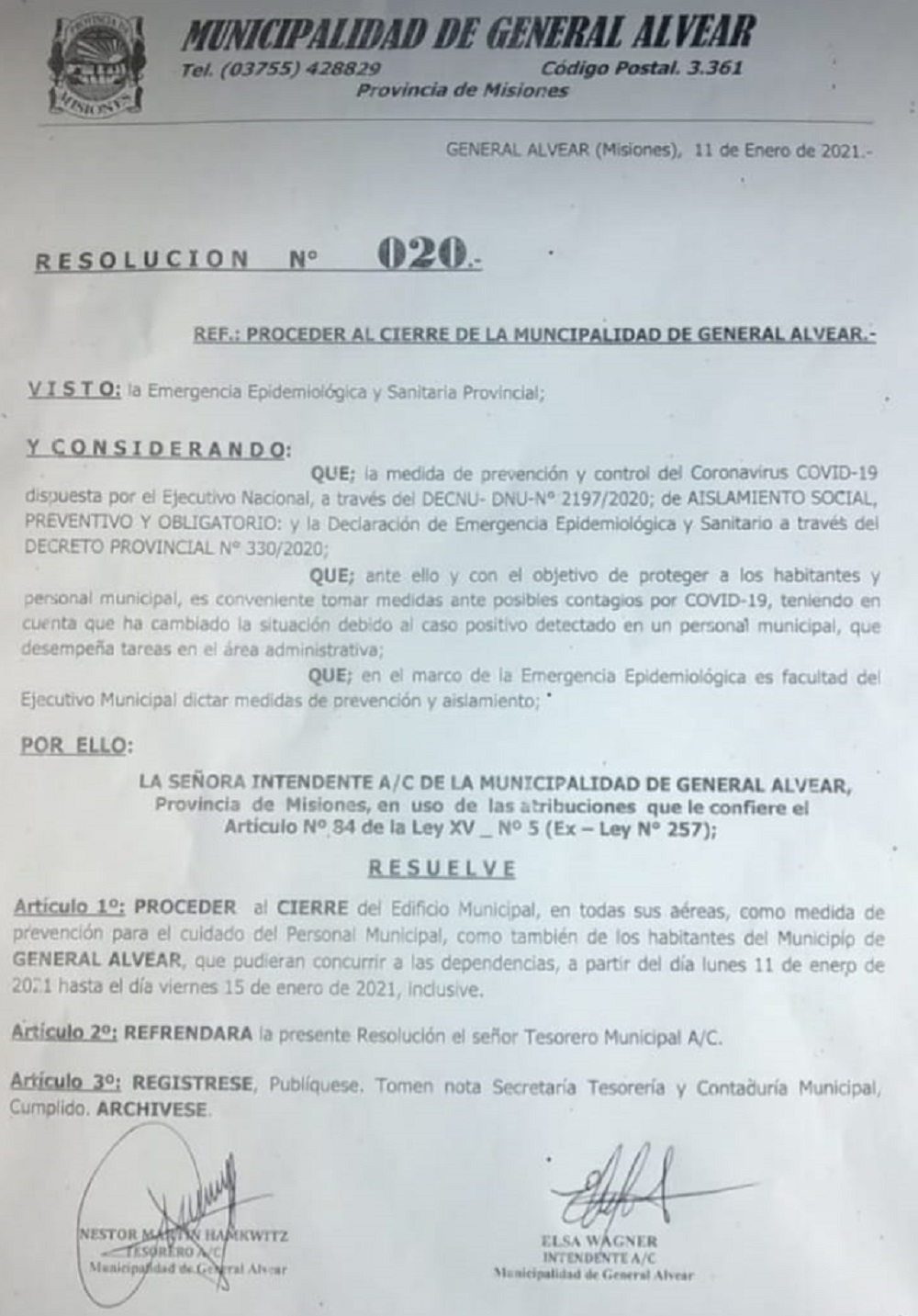 Así lo dispuso la intendente a cargo del municipio Elsa Wagner (por licencia ordinaria de su titular, Víctor Serdiuk), a través de la Resolución 20/2021 emitida hoy a primera hora de la tarde.