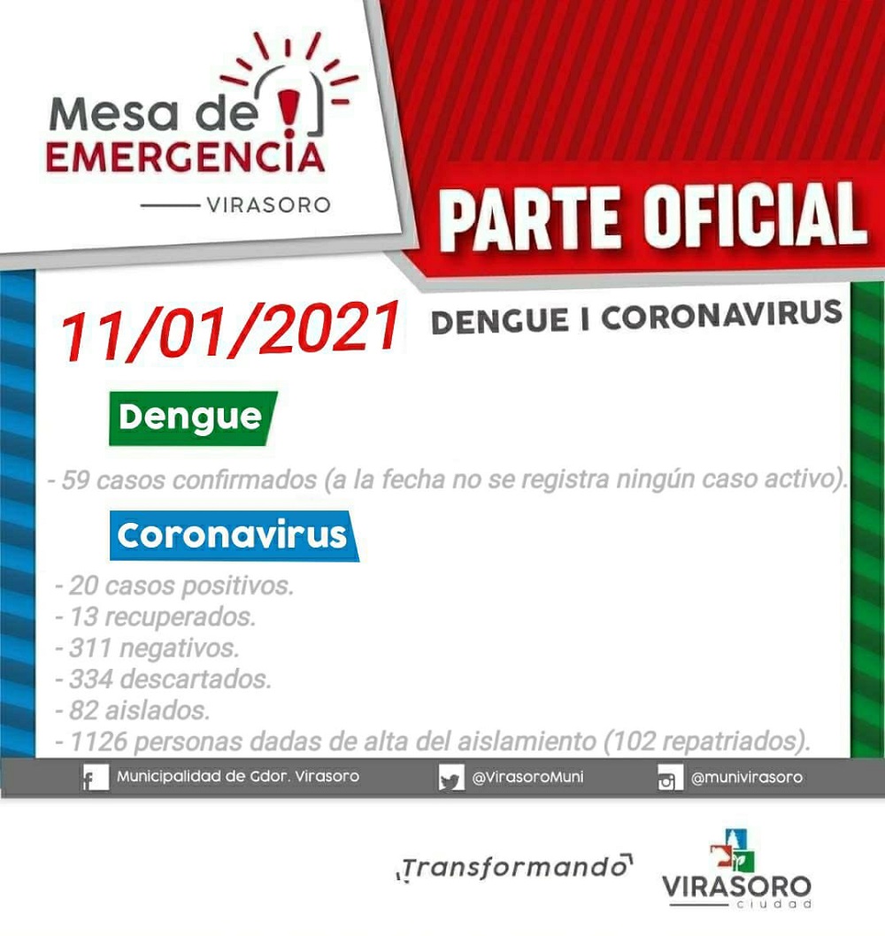 Hasta ahora, la Municipalidad de esta localidad regitró 20 casos confirmados desde el inicio de la pandemia y 13 recuperados. 311 testeos dieron positivo y 334 fueron descartados. Actualmente hay 82 personas cumpliendo el aislamiento obligatorio y se han recuperado 1126 pacientes.
