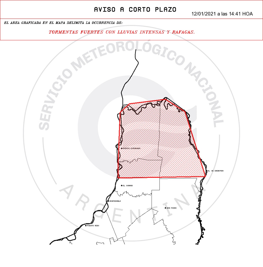 El Servicio Meteorológico Nacional (SMN) emitió a las 14:41 de este martes un “aviso de muy corto plazo” en el que advertía sobre la probabilidad de tormentas fuertes con lluvias intensas y ráfagas en los departamentos Eldorado, Iguazú y General Belgrano.