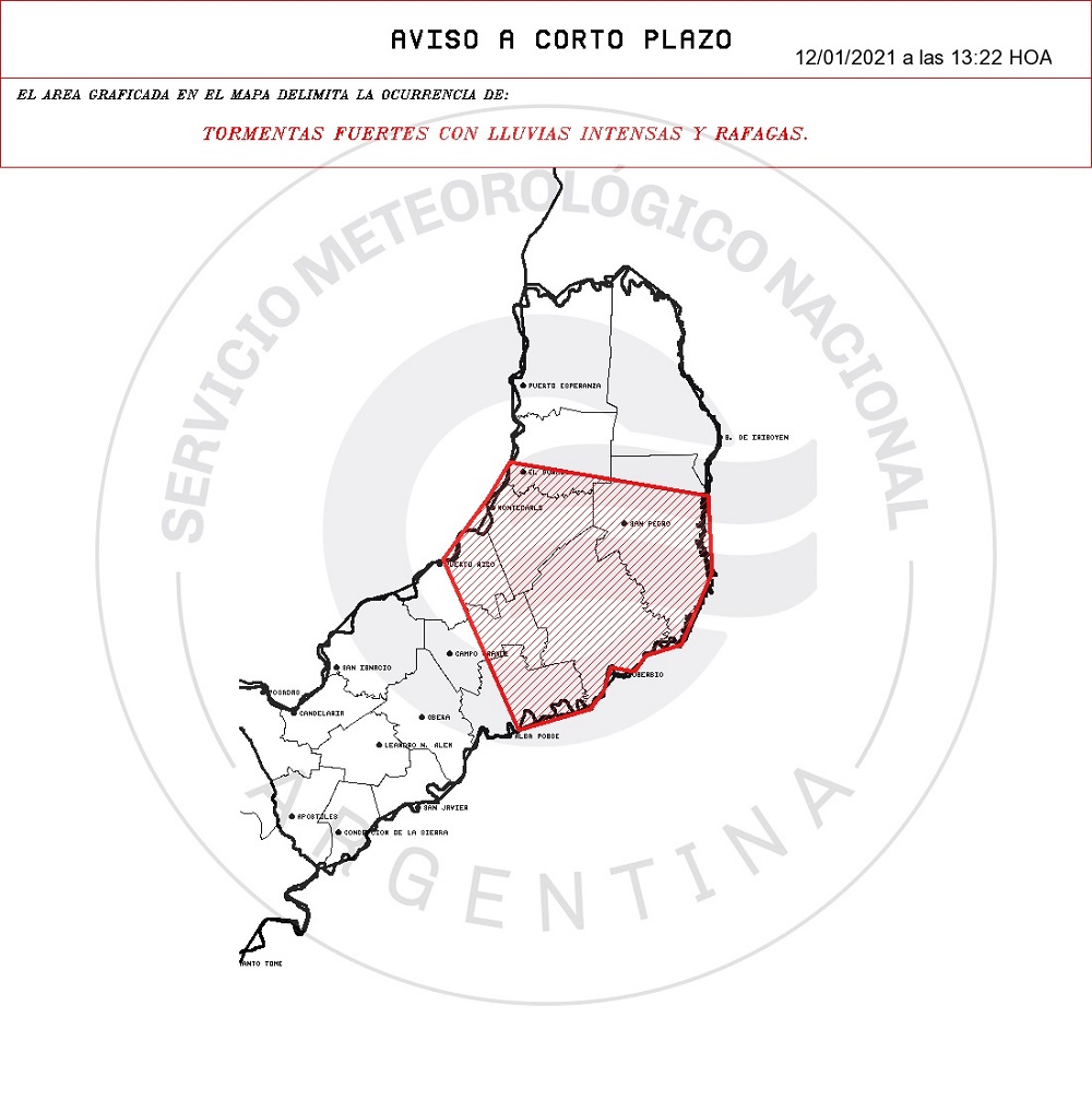 Se suma a otra advertencia similar del SMN que rigió hasta las 16.22 en otros seis departamentos misioneros: 25 de Mayo, Cainguás, Guaraní, Libertador San Martín, Montecarlo y San Pedro.