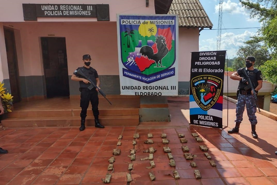En tanto, ya cerca de las 15 de hoy, en un malezal del barrio Iprodha San Miguel, en Victoria, integrantes de la Comisaría de dicha localidad incautaron 21 kilos de cannabis (35 panes), los cuales también fueron corroborados por personal idóneo de la división Drogas Peligrosas de Eldorado.