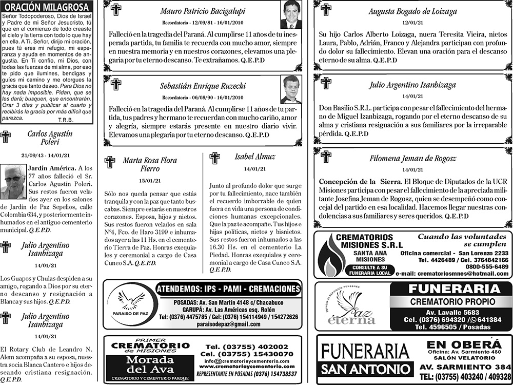 Fúnebres del Sábado 16 de Enero de 2021
