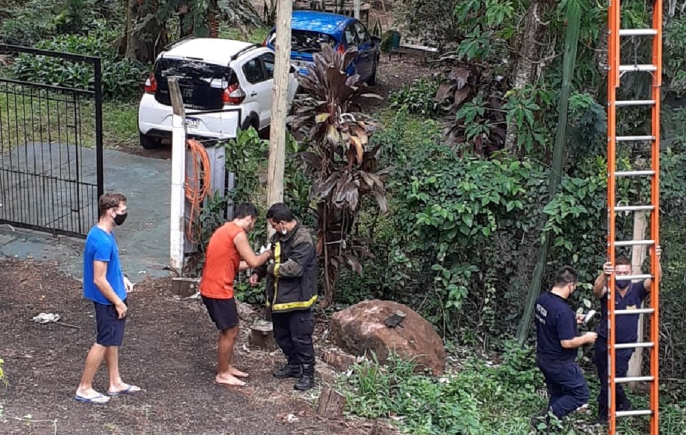 Una vez en el lugar, los efectivos tuvieron que usar una escalera de 15 metros para llegar a la altura a la que había quedado atrapado el animal, que de inmediato fue bajado y puesto a resguardo.