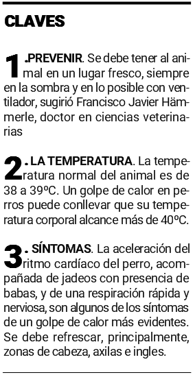 Darse cuenta que el animal está sofocado por el calor es bastante sencillo: “la lengua la saca afuera, respiración acelerada y babea. Cuando es más grave se pone tembloroso, inestable y camina con dificultad, hasta se puede caer. Entonces hay que llevarlo a la sombra, tomarle la temperatura, mojarlo con manguera lo más que se pueda y darle agua a temperatura normal. Un error es darle helada, le puede dar un shock”, sintetizó el doctor Hämmerle. Y agregó que “el animal puede tener incluso vómitos, diarrea y convulsiones”.