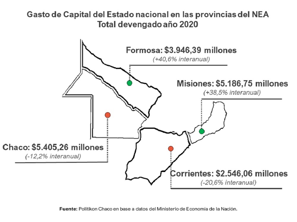 En el caso de las provincias del NEA, el alto crecimiento anual formoseño la posicionan como la provincia con el mayor gasto de capital per cápita de la región: $6.520,88 por formoseño; en la región le sigue el Chaco con $4.487,40 por chaqueño; y cierran Misiones con $4.112,25 por habitante y Corrientes con solo $2.271,64 por habitante.
