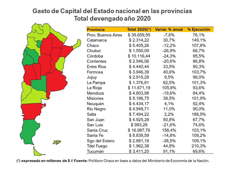 A nivel per cápita se observan notables asimetrías entre las provincias. Santa Cruz encabeza el ranking: en el 2020 el gasto de capital realizado en la provincia por parte del estado nacional equivalió a $43.425,97 por santacruceño; le sigue La Rioja con $29.657,61 por riojano y $11.314,98 por fueguino.
