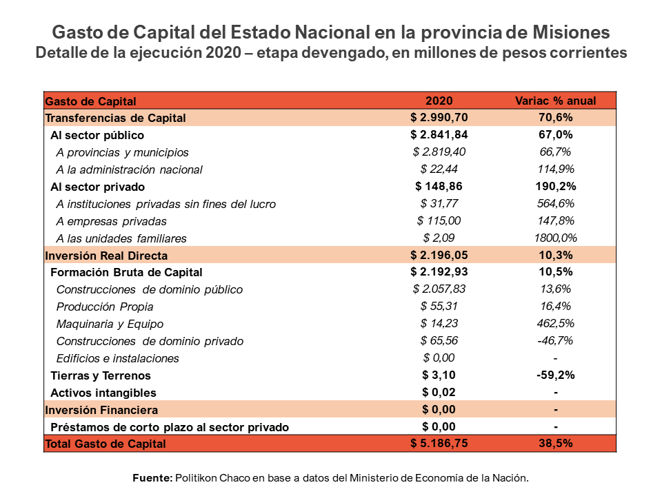 De acuerdo a un informe elaborado por la consultora Politikon Chaco, el gasto de capital de la Administración Pública Nacional en la provincia de Misiones durante el año 2020 totalizó 5.186,75 millones de pesos y creció un 38,5% respecto al año 2019. En ese marco, las transferencias se incrementaron un 70,6% y la inversión real directa un 10,3%.