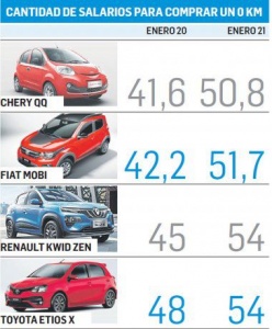 Si se toman algunos de los modelos más accesibles del mercado y se los contrasta contra el salario mínimo vital y móvil, se llega a la conclusión de que hoy se necesitan alrededor de 10 sueldos más que en enero de 2020 para adquirir un 0 km chico. Por ejemplo, un Fiat Mobi requiere ahora 51,7 SMVyM mientras que a comienzos del año pasado demandaba sólo 42 salarios. También se podría decir que, en la actualidad, la cantidad de sueldos que se necesitan para comprar uno de estos modelos es 20% más que un año atrás. Lo mismo sucede con otros casos como el Chery QQ, el Renault Kwid, el Toyota Etios o cualquier modelo de este segmento.
