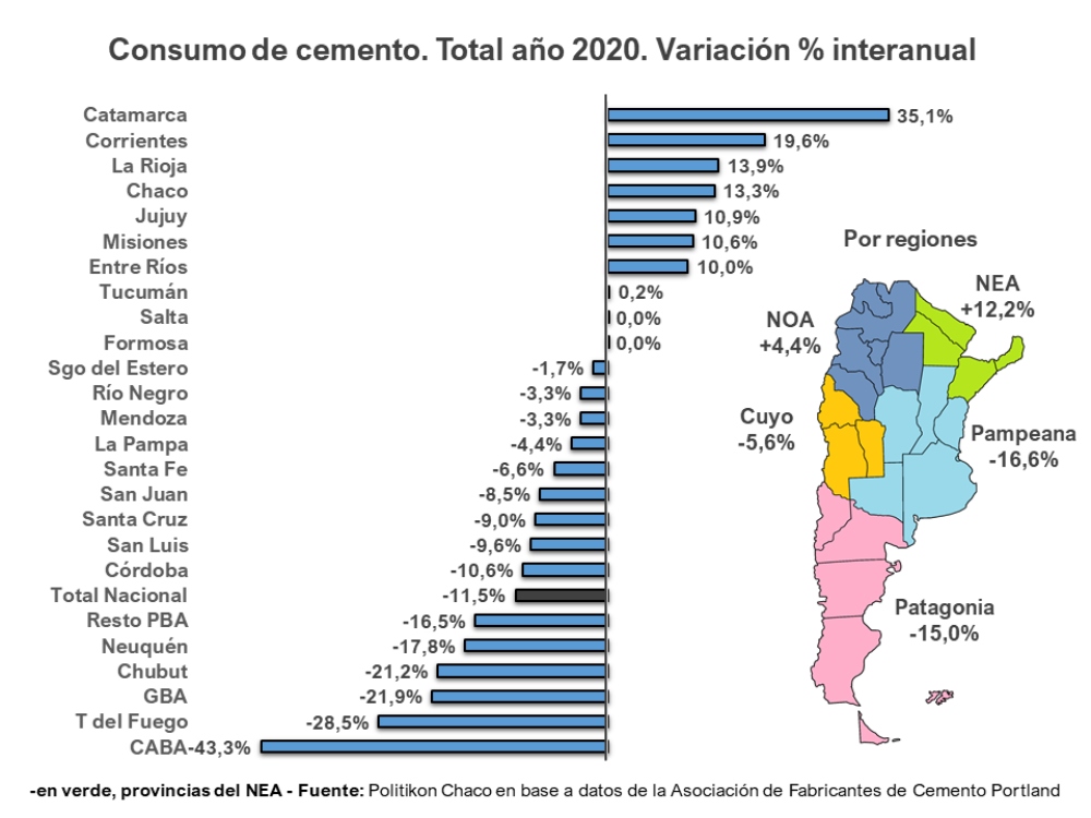 Pero en términos de volumen, Misiones es la principal consumidora de cemento en el NEA, participando del 30,6% del total consumido en la región durante el 2020. Por su parte, Chaco lo hace en un 28,5%, Corrientes en un 27,7% y Formosa en 13,2%.