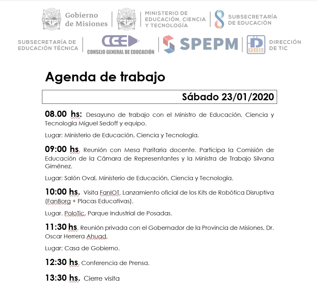 A las 10 visitará el FanIOT donde se realizará el lanzamiento oficial de los kits de Robótica Disruptiva. 11.30 tendrá un reunión con el gobernador de Misiones, Oscar Herrera Ahuad.