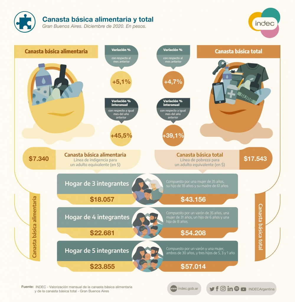 Una familia tipo necesitó $54.208 en diciembre último para no caer en la pobreza y la canasta alimentaria se disparó 45,5% en el 2020, más de nueve puntos por encima de la inflación, que fue del 36,1%, informó hoy el INDEC.