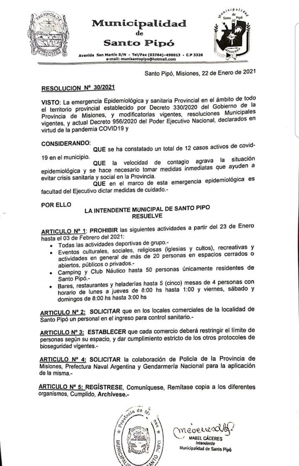 Es por ello que la Municipalidad de Santo Pipó resolvió, mediante la resolución N° 30/21, prohibir todas las actividades deportivas de grupo, así como los eventos culturales, sociales, religiosas (iglesias y cultos), recreativas y actividades en general que congreguen a más de 20 personas en espacios cerrados o abiertos, públicos o privados.